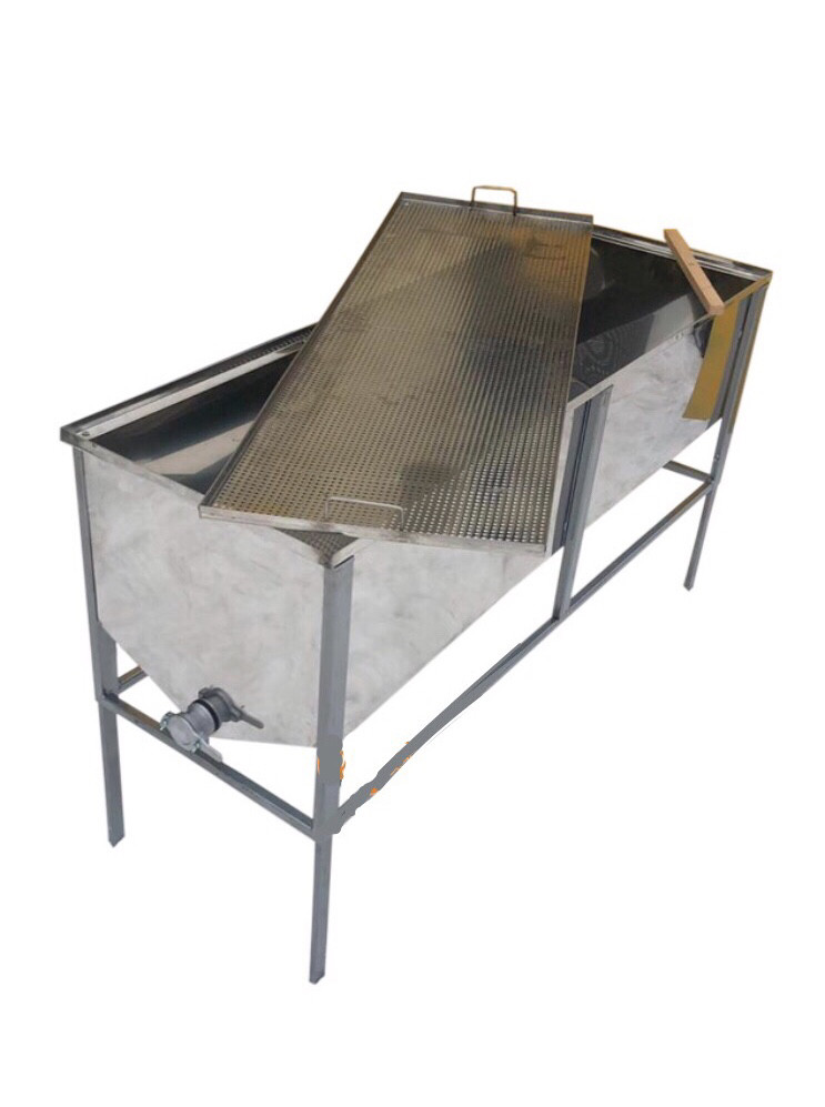 Призначений для створення найбільших зручностей при працюючому роздрукування соторамок. УВАГА!!! Оновлена Модель. Для зручності транспортування і зберігання, підставка тепер випускається з телескопічними ніжками!!! Складається з бака, кошики, каркаса і дерев'яною поперечки з голкою. Бак і кошик виготовляються з нержавіючої сталі, каркас — з профільної труби. Бак виготовлений з ухилом у бік зливного крана. Кошик встановлюється в баку біля торця. У верхній частині столу над кошиком встановлюється дерев'яна поперечка з голкою, на якій утримується соторамка при її розкритті. Зрізані частини (забрус) збираються в кошику. Підготовлені до відкачування меду соторамки підвішують в баку, починаючи від протилежного торця його. Мед стікає зі зрізів соторамок і забрусу по днищу в бік крана. Кран алюмінієвий. У цій моделі використовується плоский кошик. Габаритні розміри столу: Довжина – 1500 мм Ширина – 500 мм Висота — 980 мм Висота зі складеними ніжками — 620 мм Маса -18 кг Внутрішні розміри кошика: Довжина – 1440 мм Ширина – 437 мм Глибина – 39 мм Матеріал ванною та кошика: нержавіюча сталь марки AISI 304, товщина 0,5 мм
